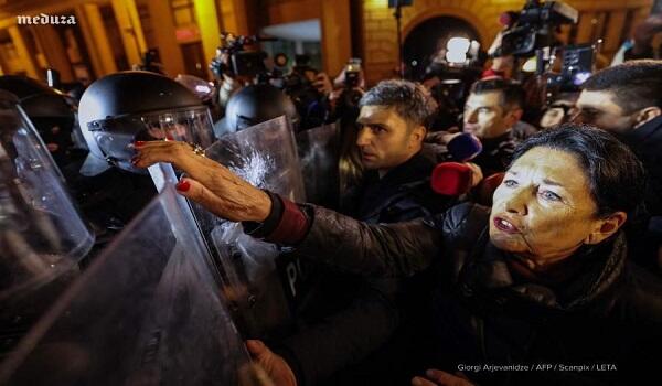 به گزارش Axar.az، سالومه زورابیشویلی، رئیسجمهور گرجستان، به محل اعتراضات گسترده در تفلیس رفته و در مقابل نیروهای ویژه مستقر در منطقه ایستاده و با آنها صحبت کرده است.