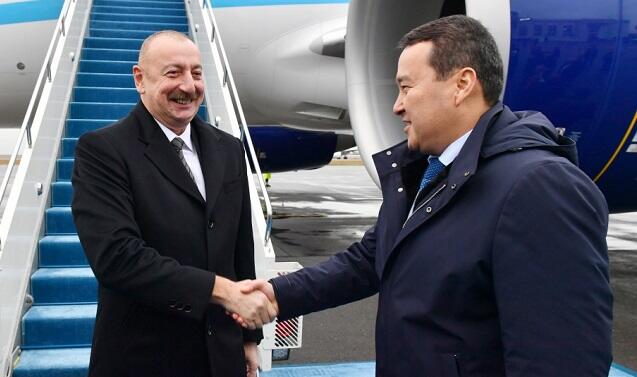الهام علی اف، رئیس جمهور آذربایجان مورد استقبال علیخان اسماعیل اف، نخست وزیر قزاقستان و دیگر مقامات قرار گرفت.